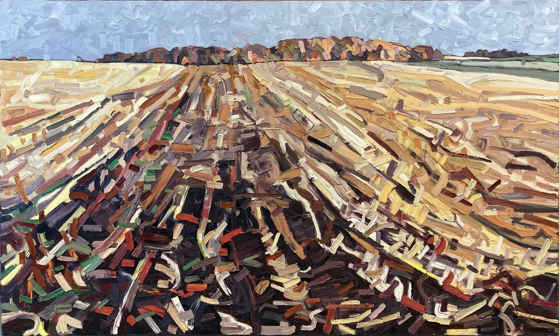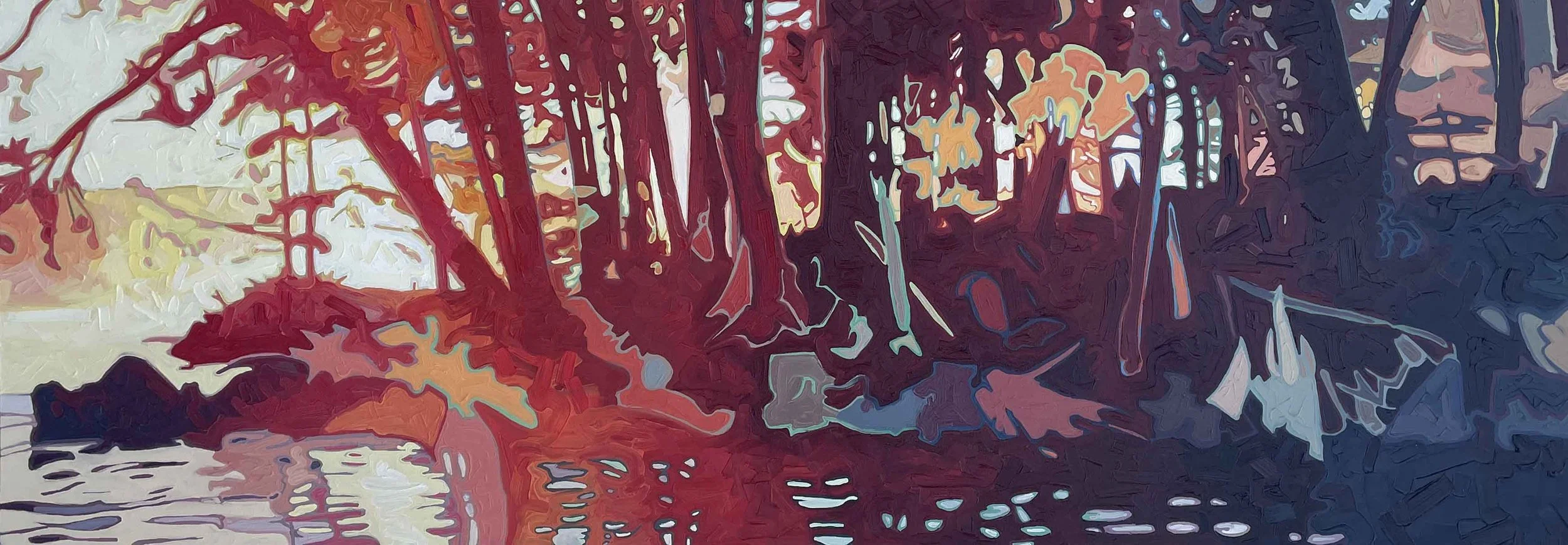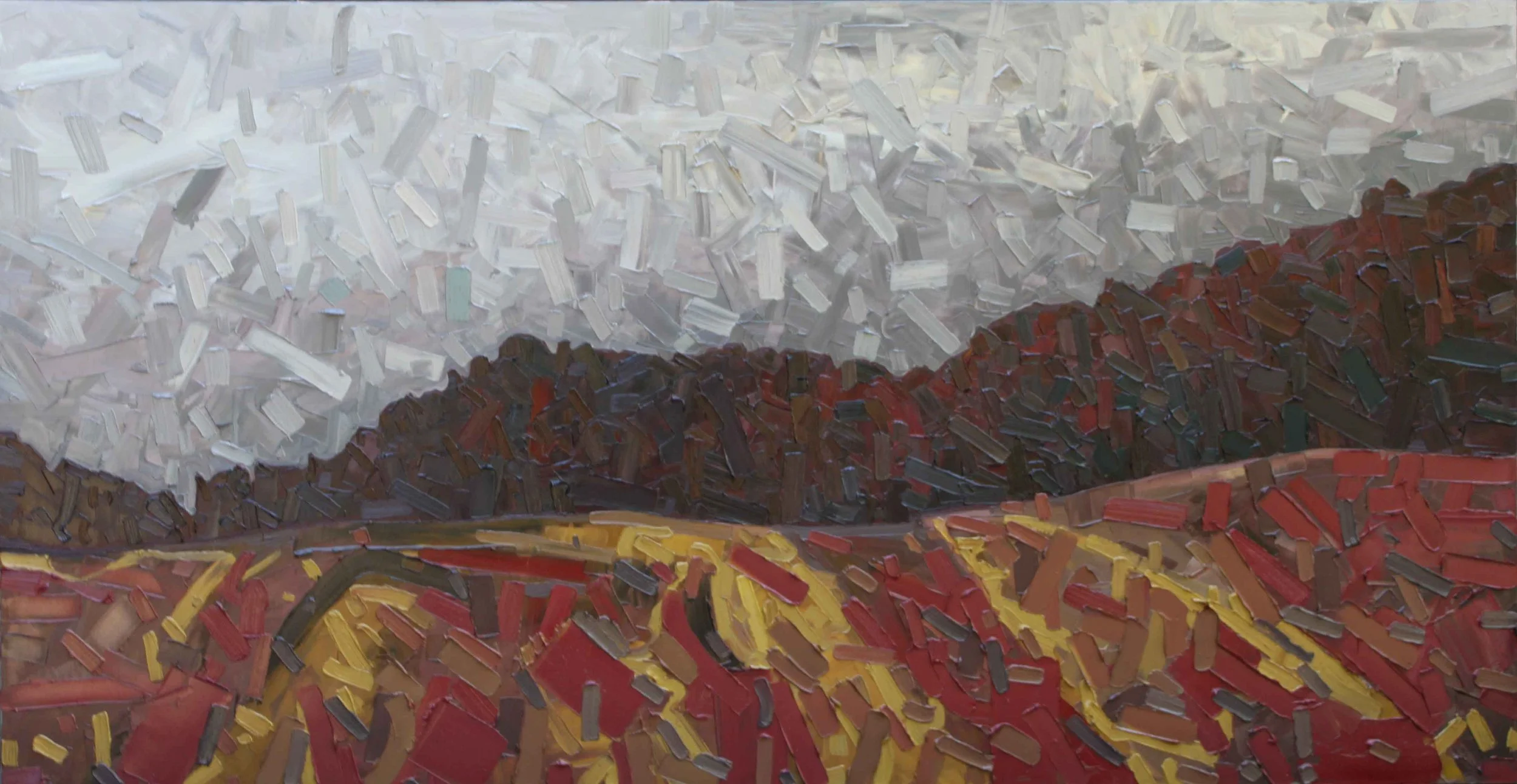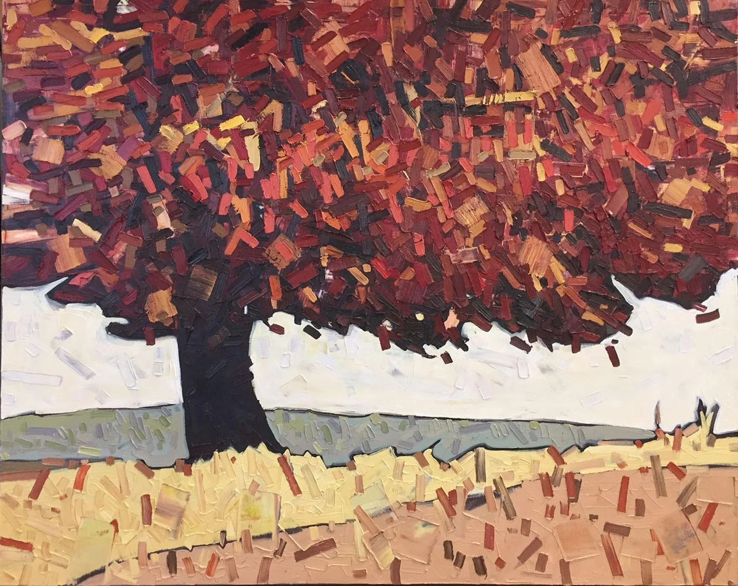 The landscape paintings often focus on one solitary tree standing alone in an open space. His technique of cropping sections allows the observer to focus more carefully on one area without taking the entire piece for granted. The use of rich, organic, autumn colours represent the maturity of the tree in the cycle of life, providing the observer wit with a strong sense of change, as the landscape ages and decays. The beauty found in aspects of time and change is the ever present theme underlying the paintings he creates.