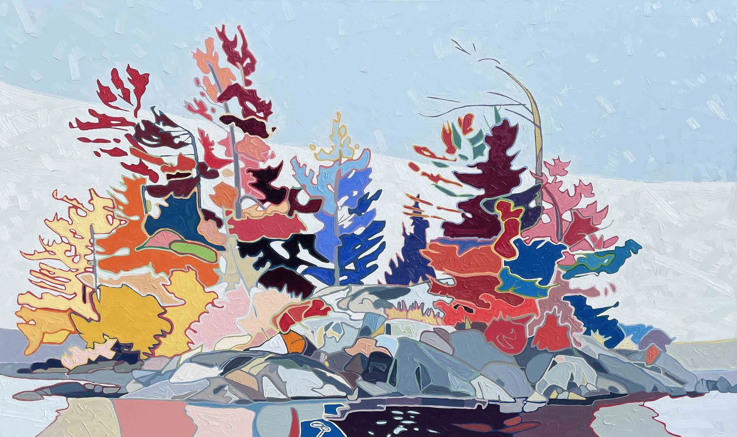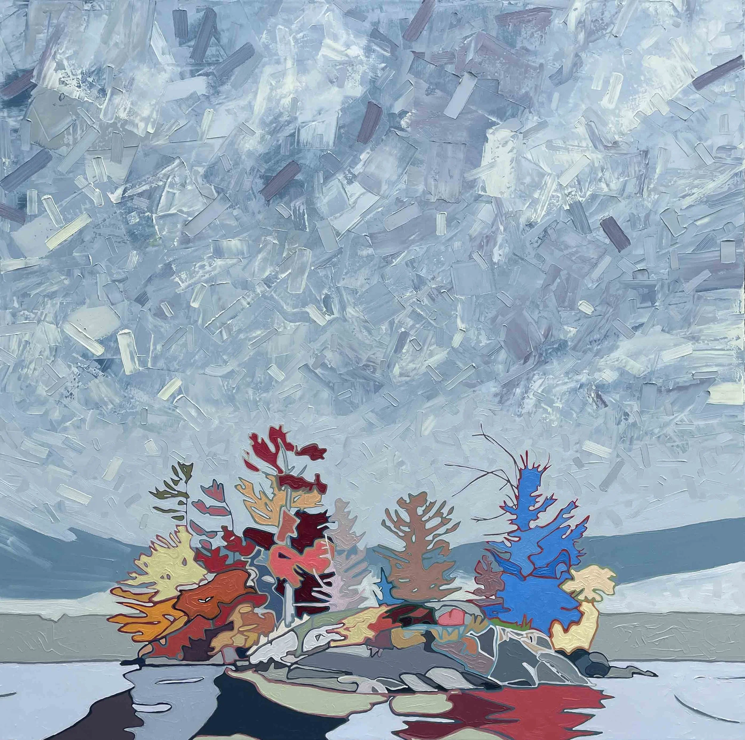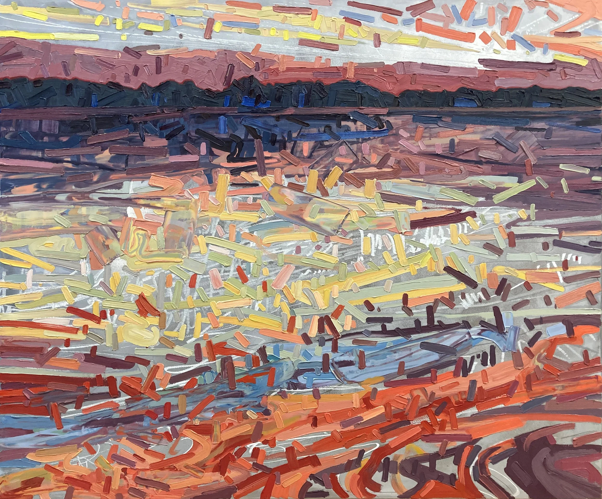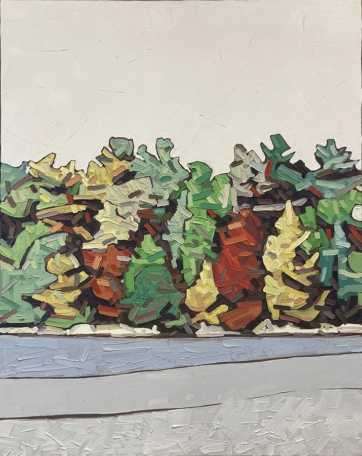 The landscape paintings often focus on one solitary tree standing alone in an open space. His technique of cropping sections allows the observer to focus more carefully on one area without taking the entire piece for granted. The use of rich, organic, autumn colours represent the maturity of the tree in the cycle of life, providing the observer wit with a strong sense of change, as the landscape ages and decays. The beauty found in aspects of time and change is the ever present theme underlying the paintings he creates.