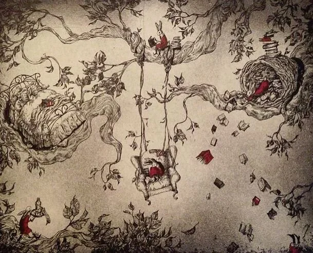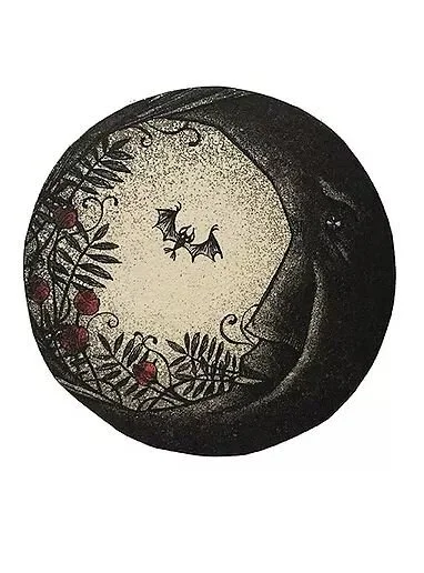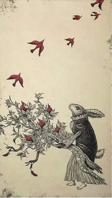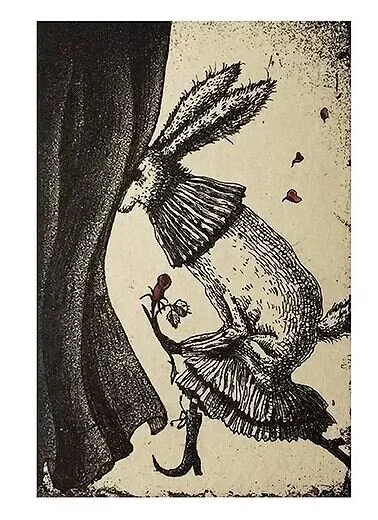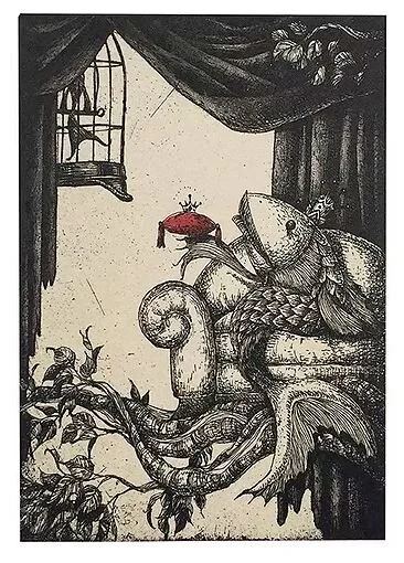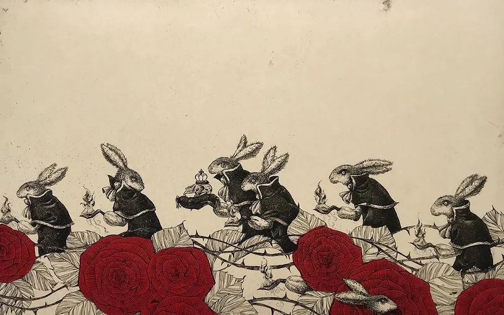 Mariko’s Prints have a storybook character about them. Animals take on the personalities of humans; there is sometimes an Alice in Wonderland distortion of scale, and inanimate objects have traits of living creatures. As we all know from our experience with childhood fairytales, storybooks can be rife with monsters, malevolent tricksters, or jealous stepsisters that threaten the well being of the innocent. There seems to be such a story behind many of Mariko’s finely wrought images.